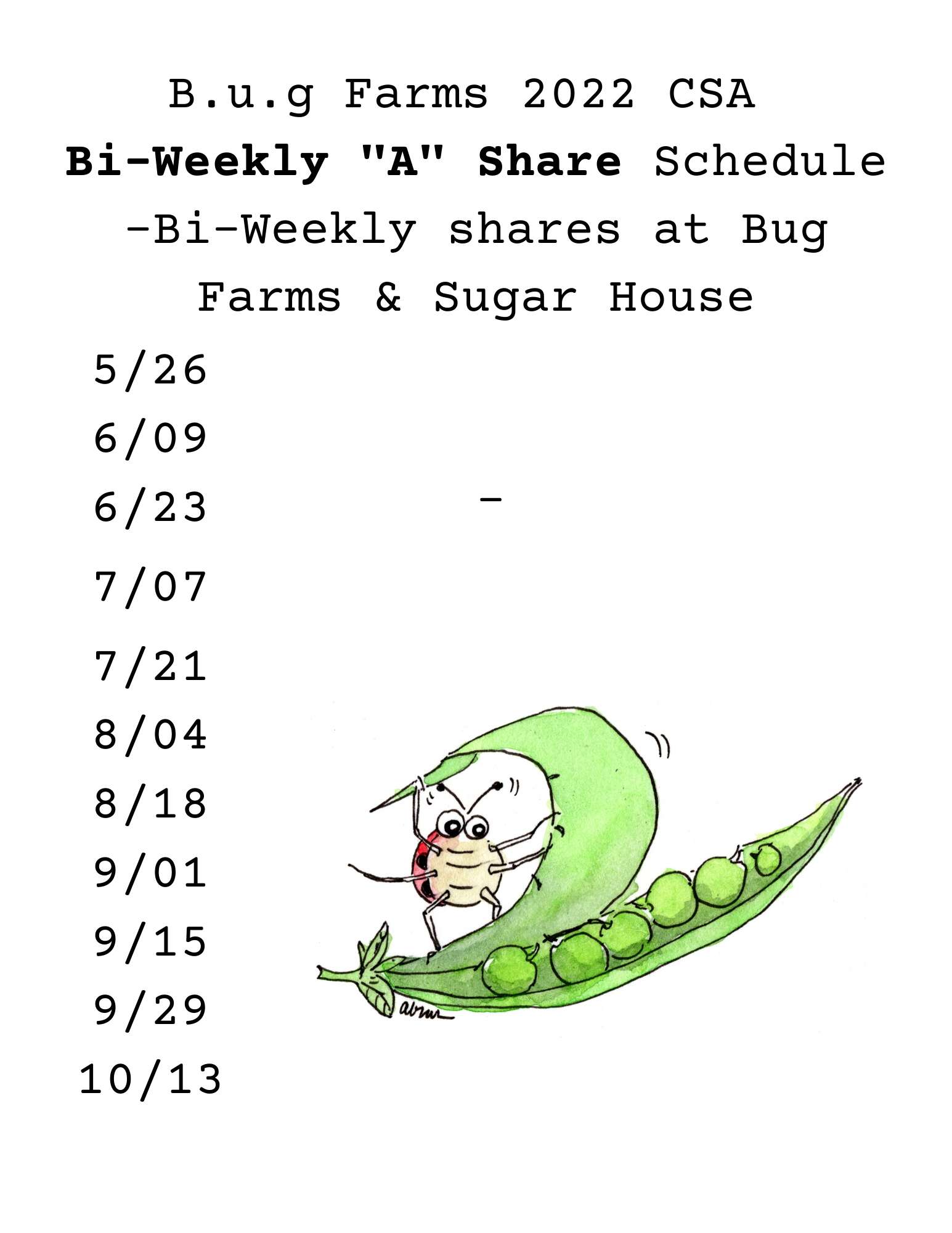 The Bug CSA Operates one Full Share Schedule (weekly), and 2 Half Share Schedules (bi-weekly), which are divided into alternating “A” Weeks and “B” Weeks.